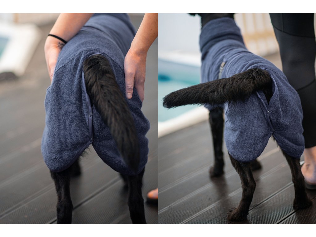 NÁŠ TIP: pre čo najdôkladnejšie osušenie pretiahnite kapucňu cez uši psa a zapnite cvočkou pod chvostom zadnú časť župana