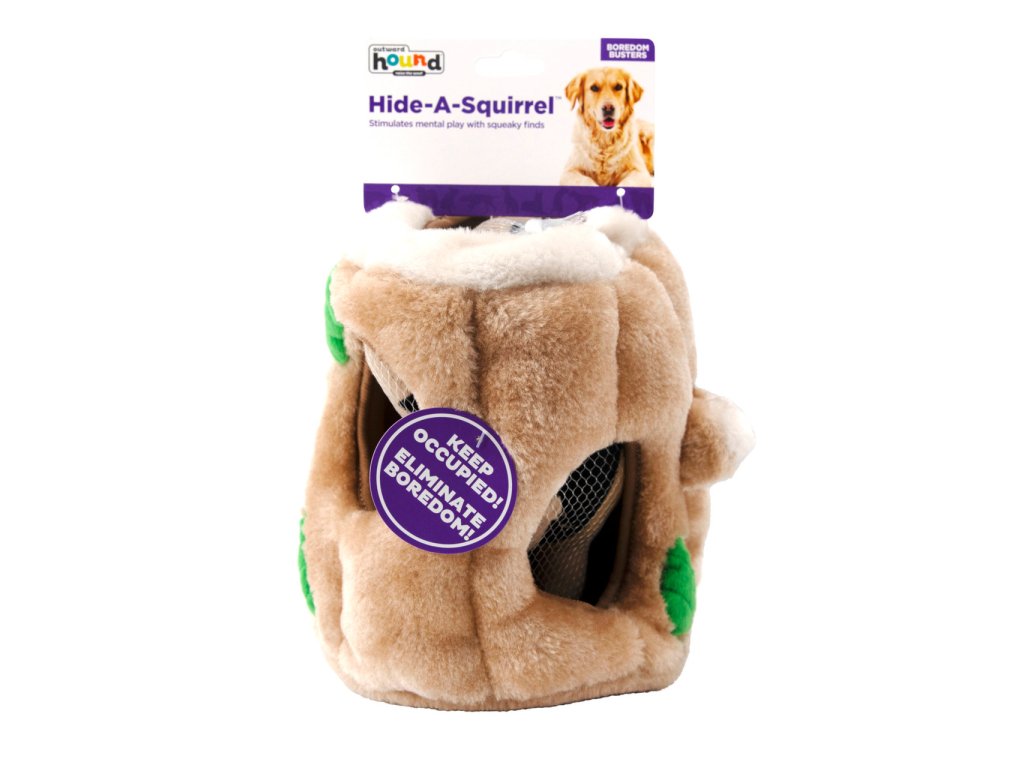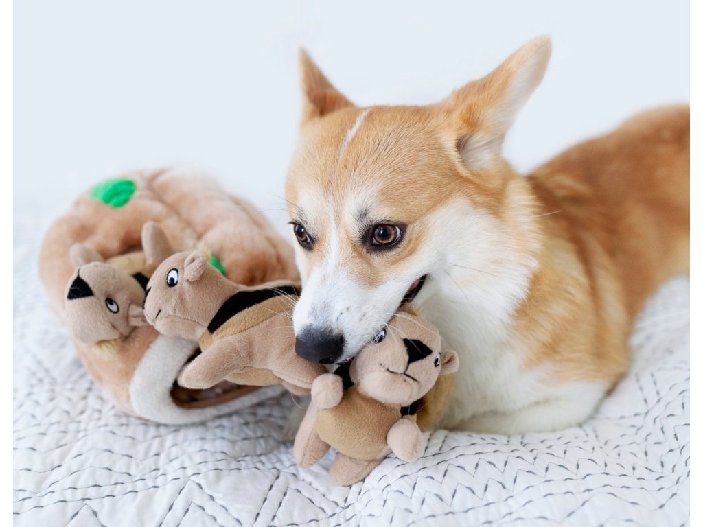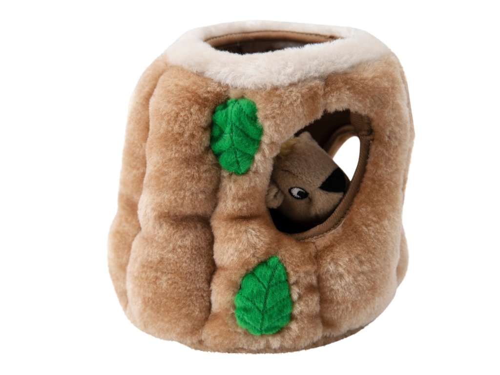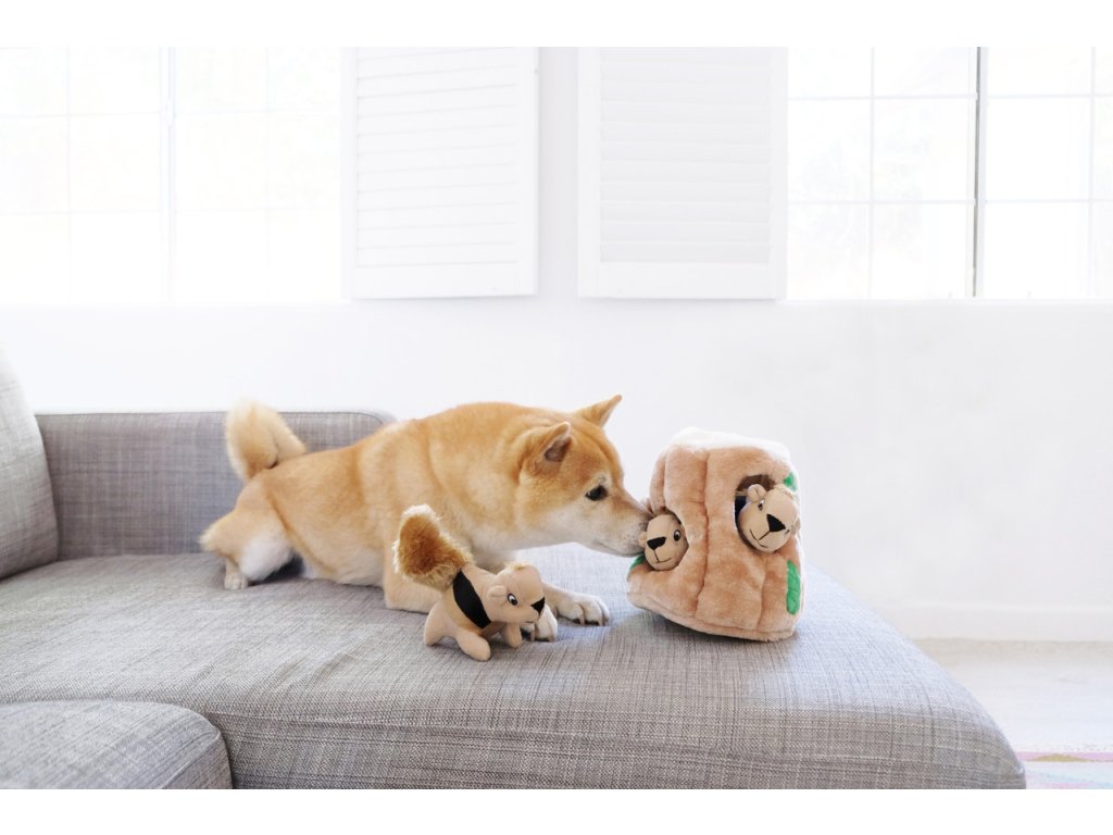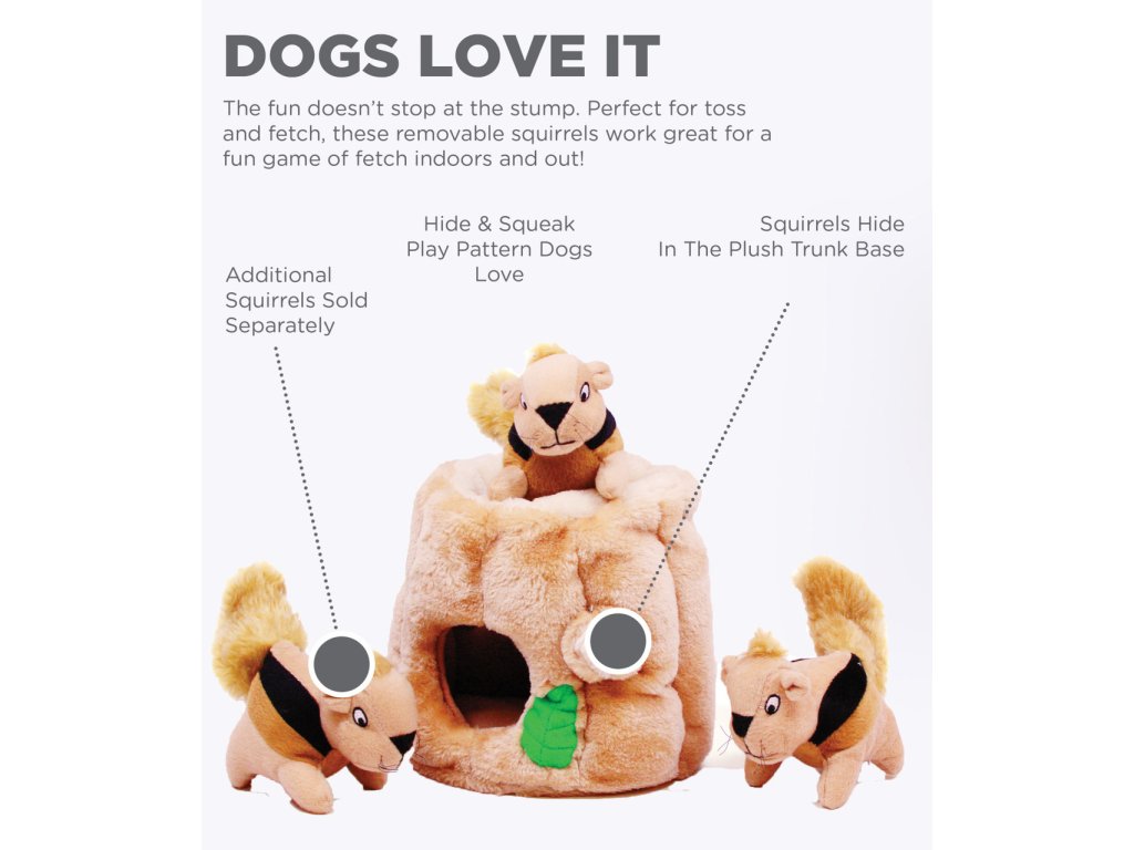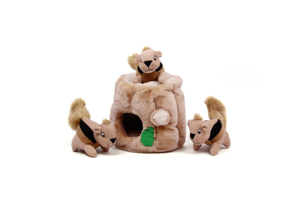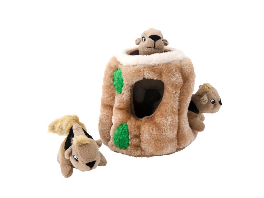 Plyšové puzzle Veveričky v pníku obsahujú plyšový pník stromu s niekoľkými otvormi a s troma pískacími veveričkami, ktoré môže psík hľadať, vyťahovať a následne to najlepšie - hrať sa s nimi. :)