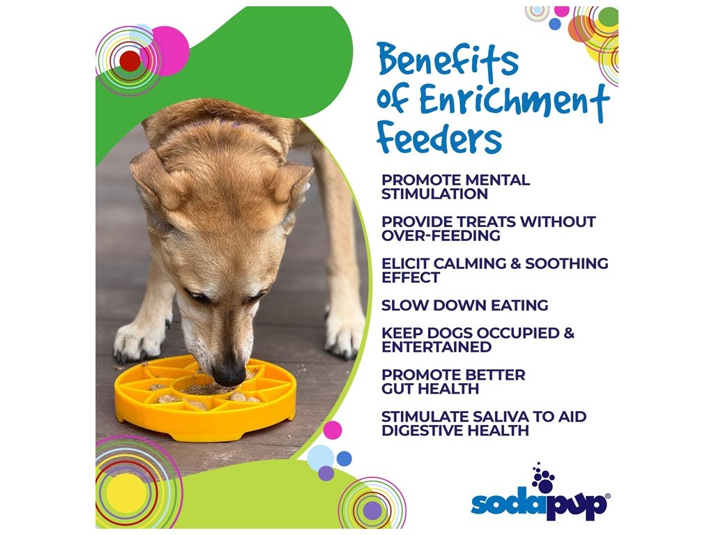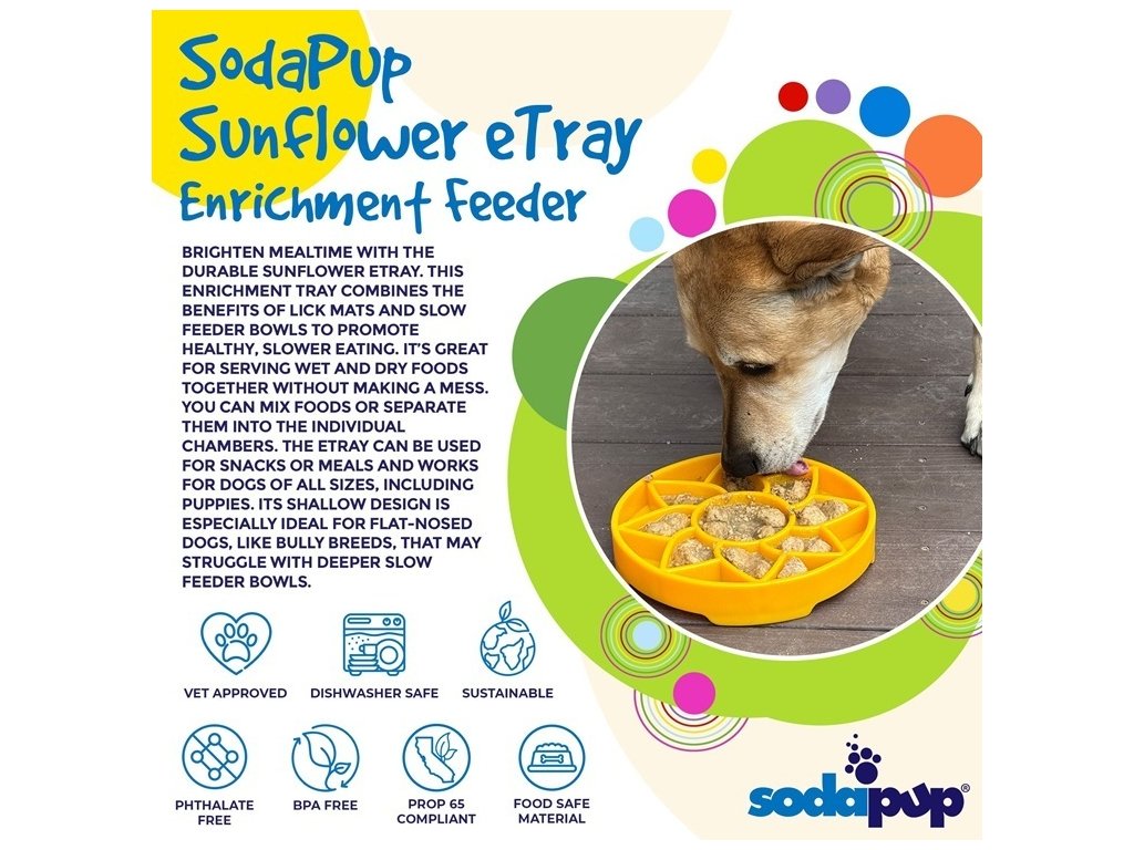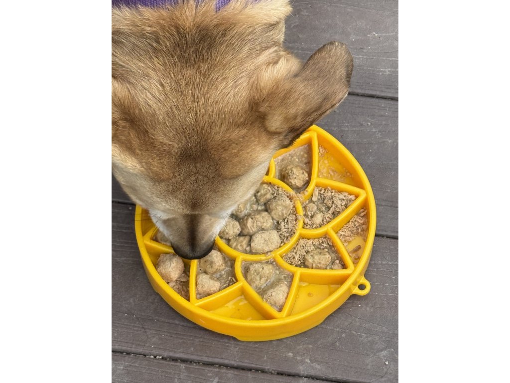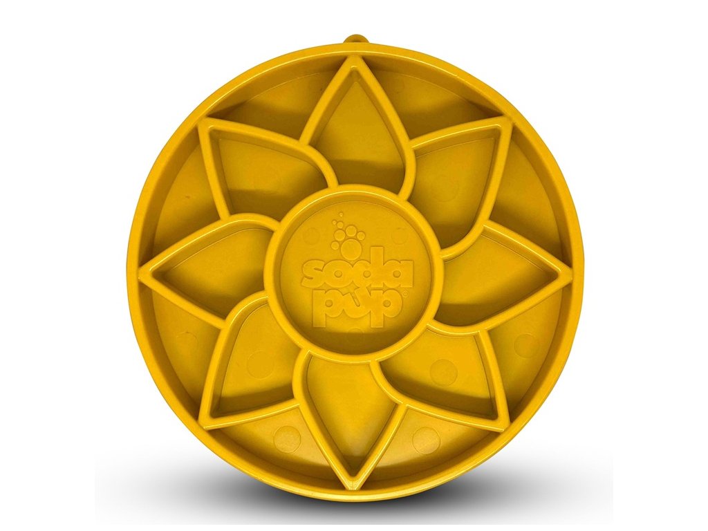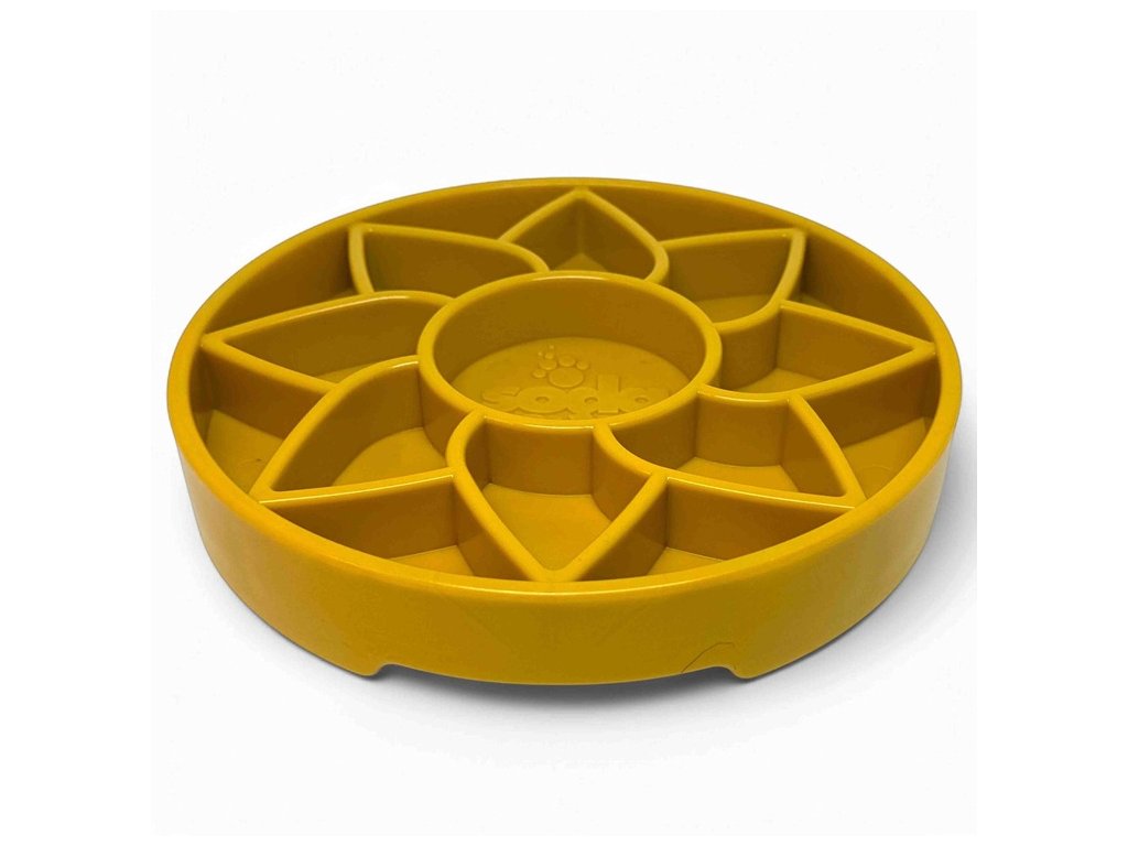 Plytká spomaľovacia miska s dizajnom inšpirovaným kvetom slnečnice je navrhnutá tak, aby spomalila jedenie psa a zároveň stimulovala jeho inštinkt hľadania potravy.