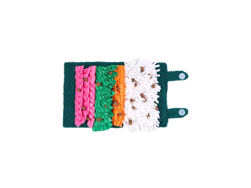 Koberček má 4 rozdielne tvary látky na ukrytie pamlskov, pripomínajúce ingrediencie sushi rolky a vyšívanú usmiatu tvár. Dá sa zrolovať a zapnúť na suchý zips, čo je praktické na skladovanie a cestovanie.
